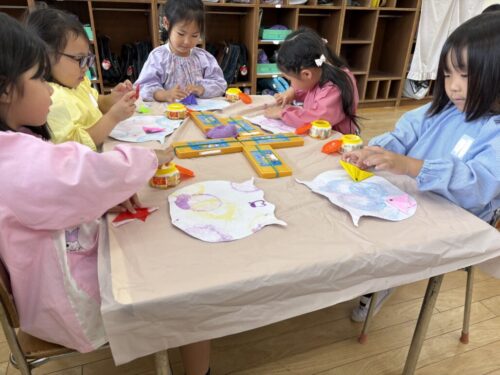 技法遊びでしゃぼん玉液とえのぐを混ぜてあわを画用紙につける『あわ写し』に挑戦しました。好きな色のえのぐしゃぼん玉液を選び、ストローで吹いて泡をたくさん作ります。「わー!こぼれちゃう!こぼれちゃう!!」と言いながら容器から溢れるくらいあわができたら、画用紙をつけます。画用紙についたあわを見て「すごいかわいい!!」と大喜び。このあわ写しを水の中に見立てて、金魚鉢にしました。別の日に折り紙で金魚を作って貼り合わせると、かわいい作品になりました♬
