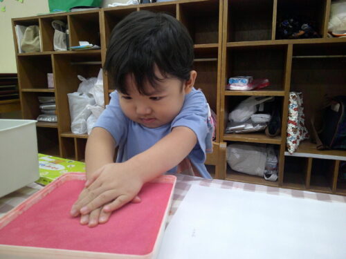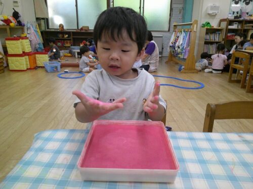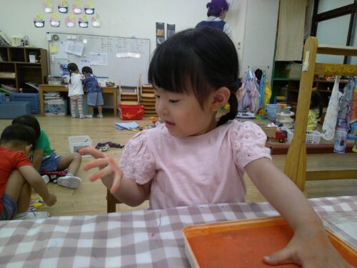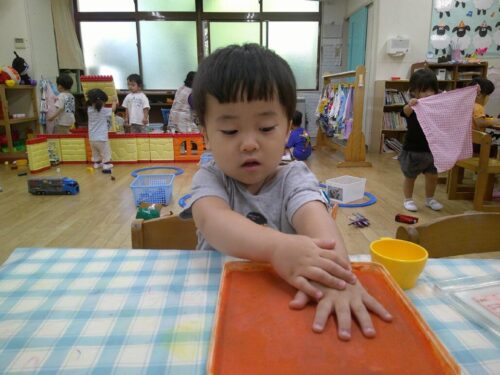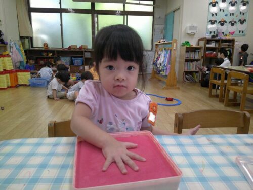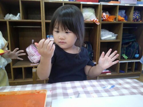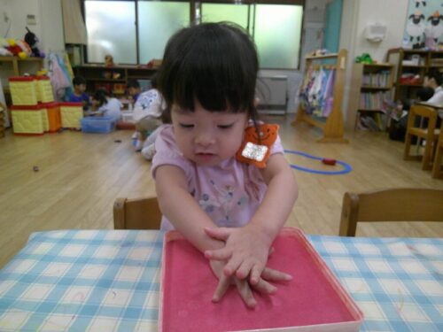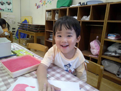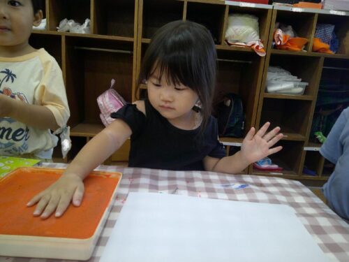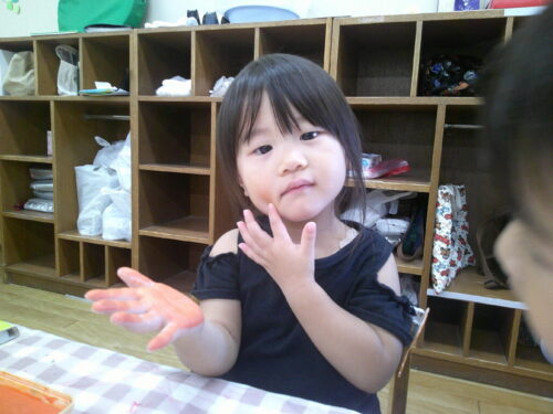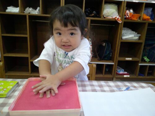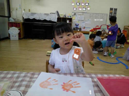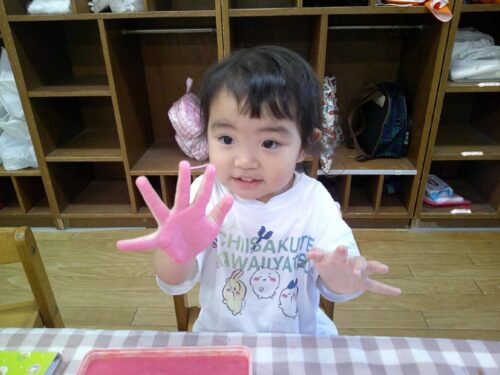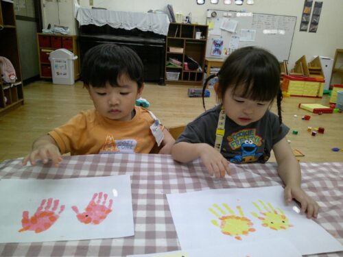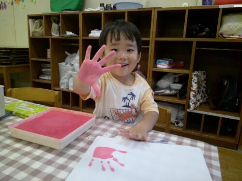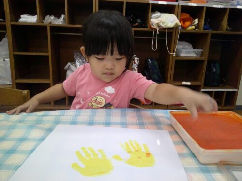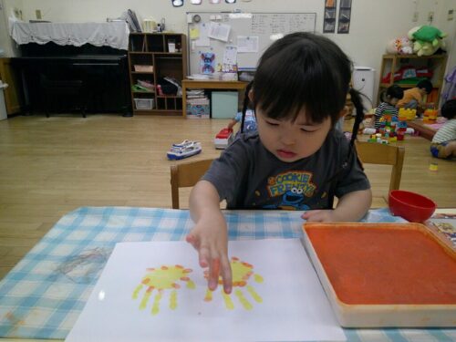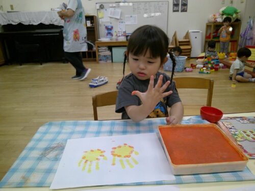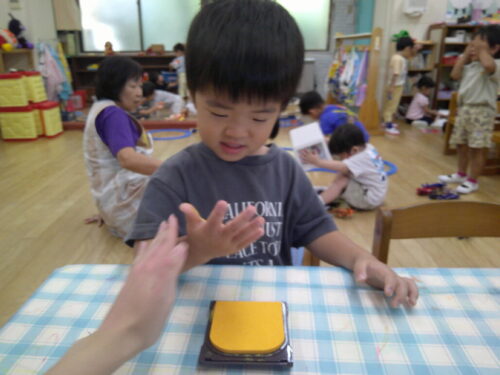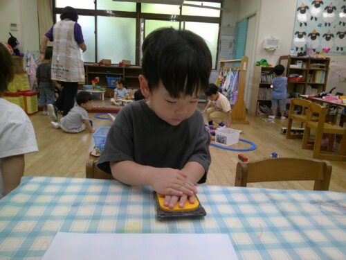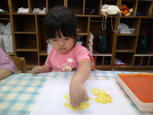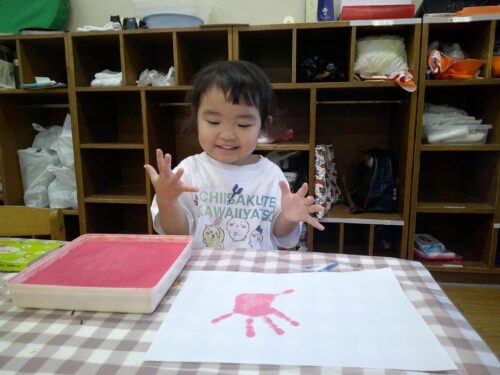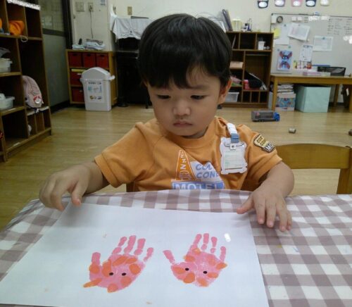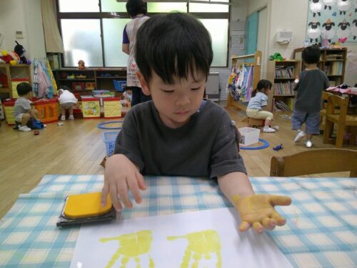 スタンプ台に手のひらを置いてインクをつけ、ぺったんと押すと、子どもたちの小さくてかわいいてのひらがライオンに大変身!