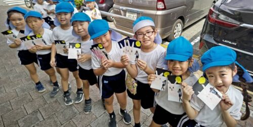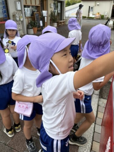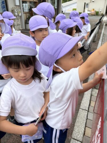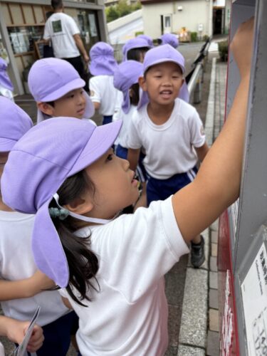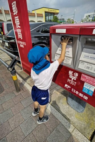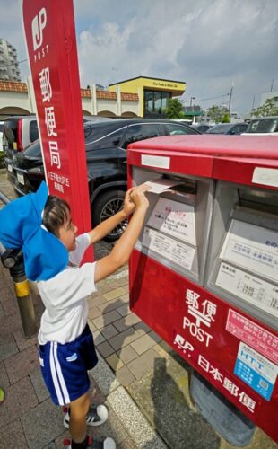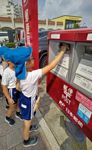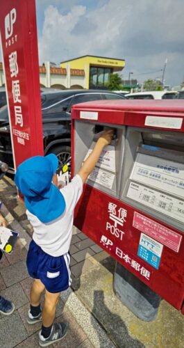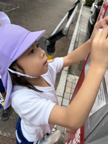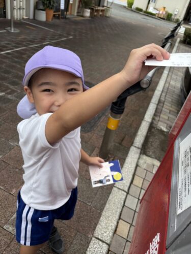 出来上がった絵ハガキをポストに投函しに行きました。ポストに入れる時に「届きますように」と言って投函していました☺