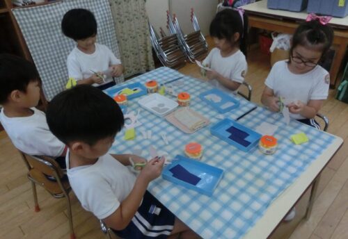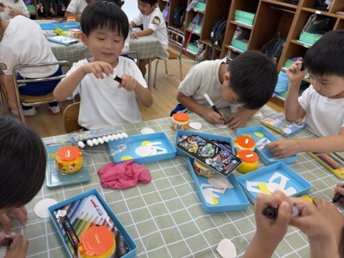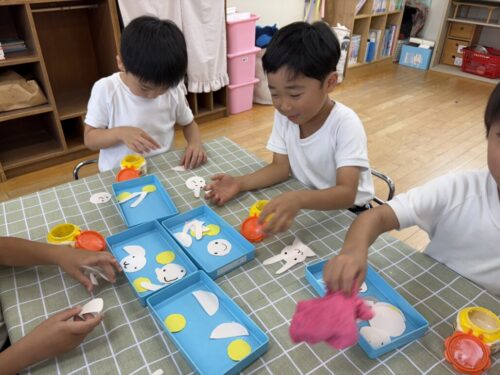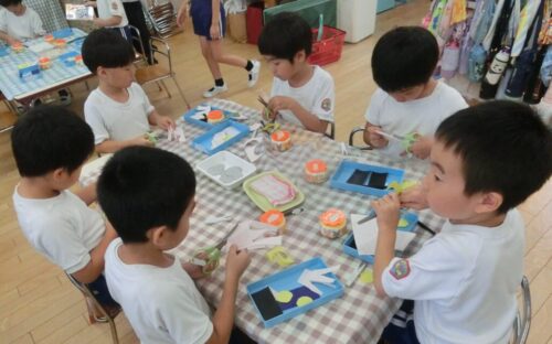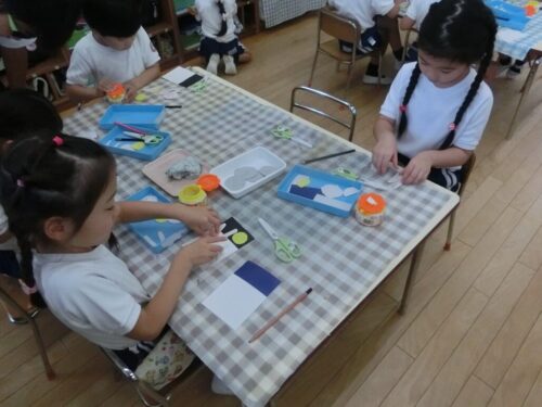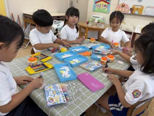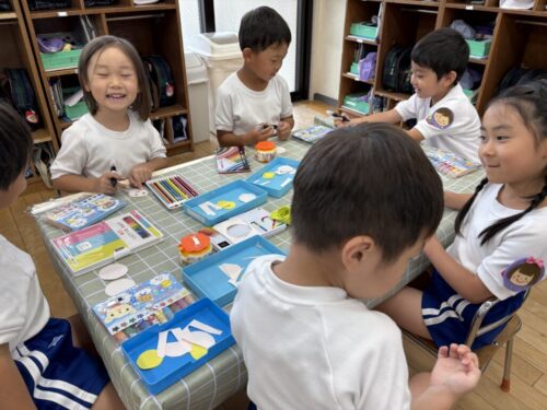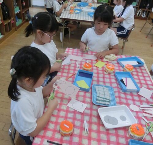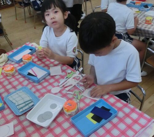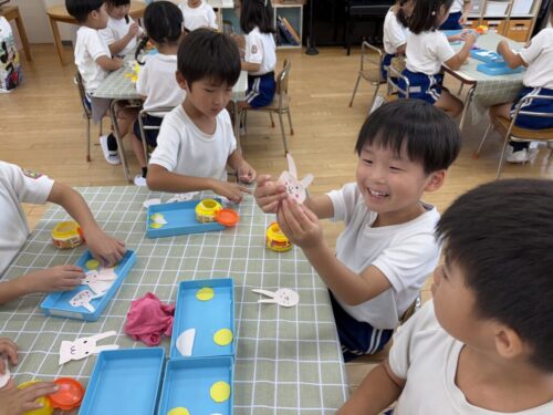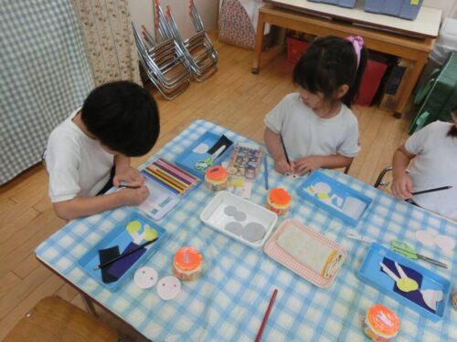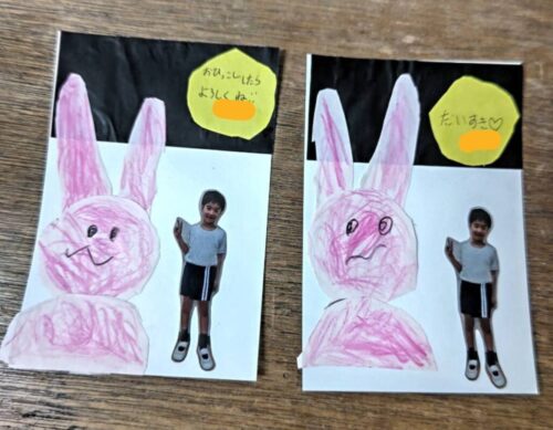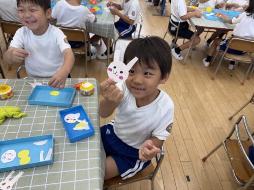 うさぎの顔を描き、パーツを組み合わせ、はがきに貼っていき完成です!最後にメッセージと子どもたちの写真付けていきました。夏休みにおじいちゃんおばあちゃんの家に遊びに言った子も多かったので、その時の出来事を思い出しながらメッセージを考えていました😊