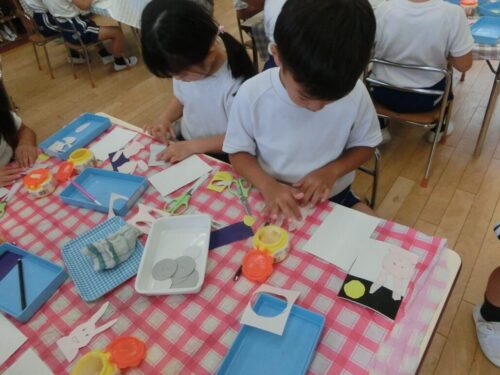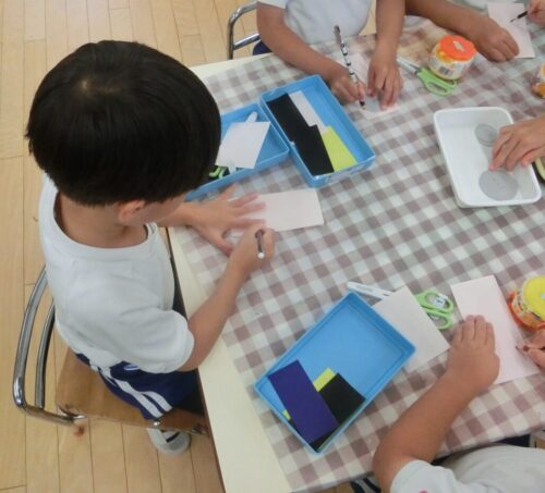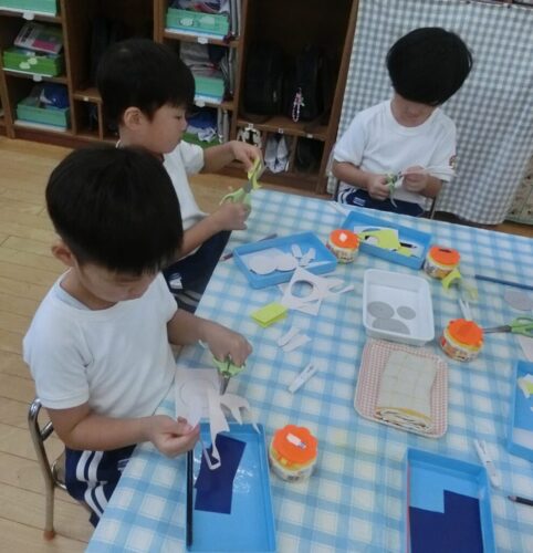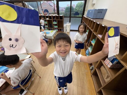 最初は月とうさぎの型取りをしました。大きさ違いの丸を用意し、紙に丸を置いて色鉛筆で型を取っていきました。子どもたちから「うさぎの耳は?」と聞かれたので、自分の指を型取ることを伝えると、紙の上に指を置いて型取りをしていました。型ができたらはさみで切っていきました。難しいところもありましたが、おじいちゃん、おばあちゃんに届けたい!という気持ちを込めて作っている子がたくさんいました✨