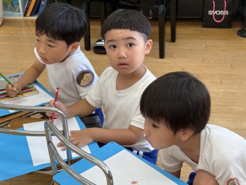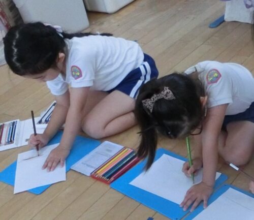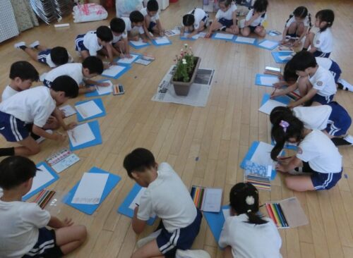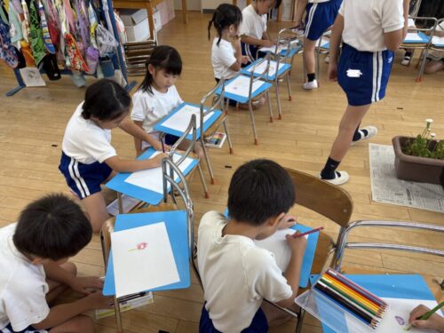 今回はアスターを見ながら、観察画を描きました。花びらが多いこと、中心は色が違うことなどに気づきながら色鉛筆を使って丁寧に描くことができました!