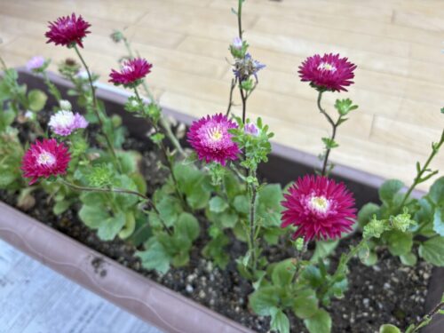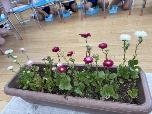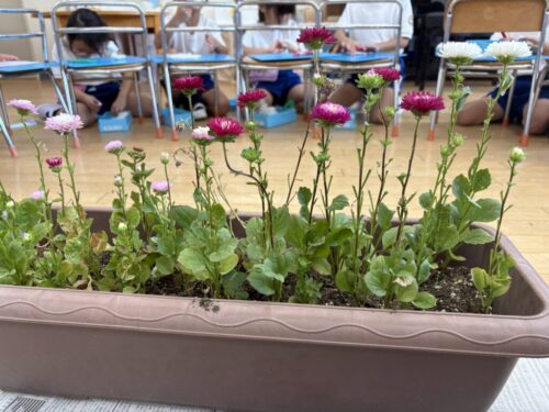 『大きなアスター』という種を蒔いて1学期から水やりをしていましたが、夏休み中にやっと咲きました。夏期保育中に「あっ咲いてる!」「大きなアスターって書いてあるのに小さいね💦」「いろんな色が咲く種だったんだね」と咲いたことを喜び、たくさんの言葉が聞こえてきました。
