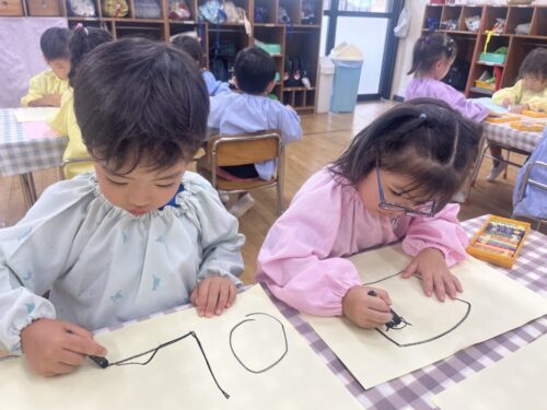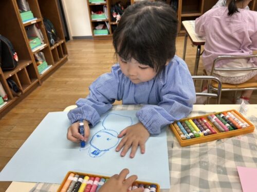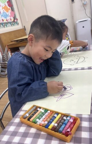 自分の好きなものをイメージしながら、クレヨンで大きな画用紙に思いおもいの絵を描きました!