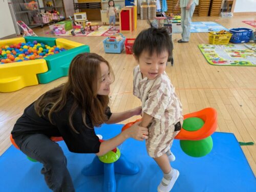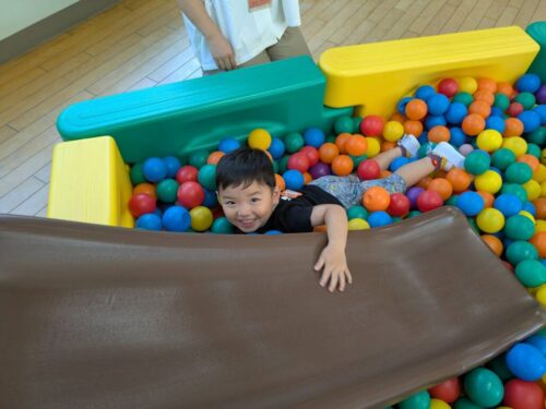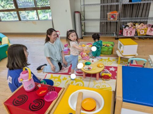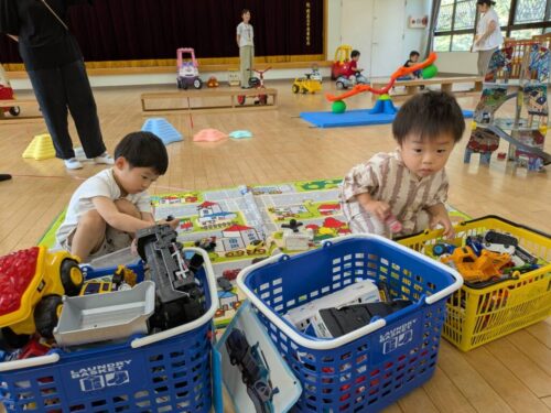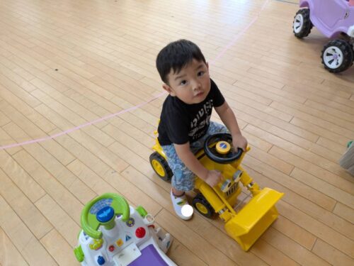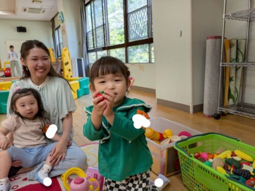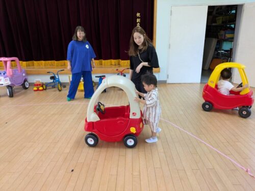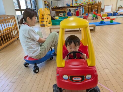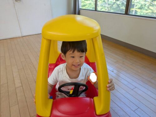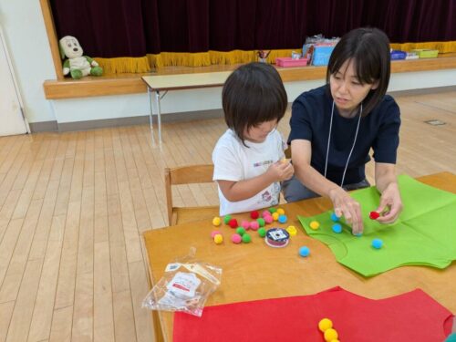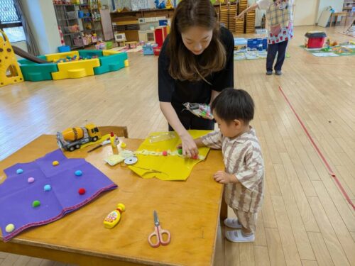 すっかり幼稚園のホールに慣れたバンビーノのお友だちは、出席カードにシールを貼ると、好きな遊びのところまで走っていく姿が見られるようになりました。