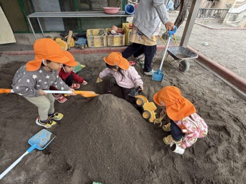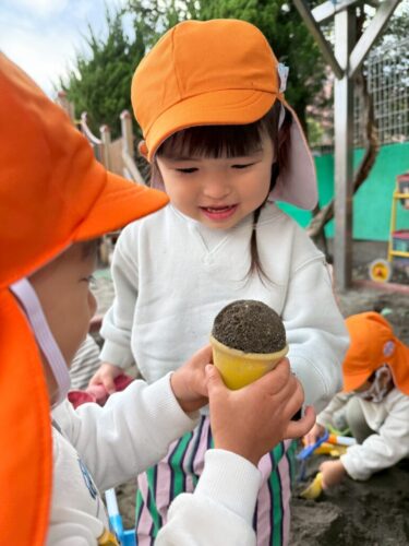 最近は遊びの幅も広がり、前までは外に出ると一目散に砂場に行っていた子が多くいましたが、最近は友だちや保育者と一緒に追いかけっこやかくれんぼをする姿や、縄跳びを使って電車ごっこをしたり、ボールを蹴ってサッカーをしたり、転がしたボールを誰が早く取れるか対決をしたりと身体を使って遊ぶことも楽しんでいます。