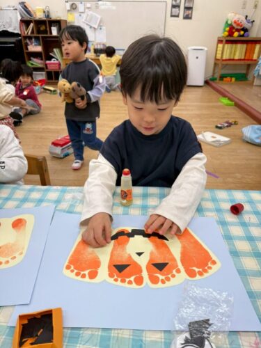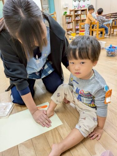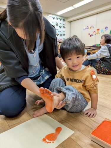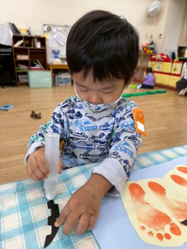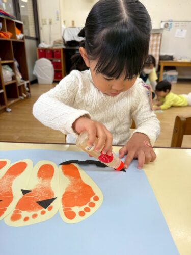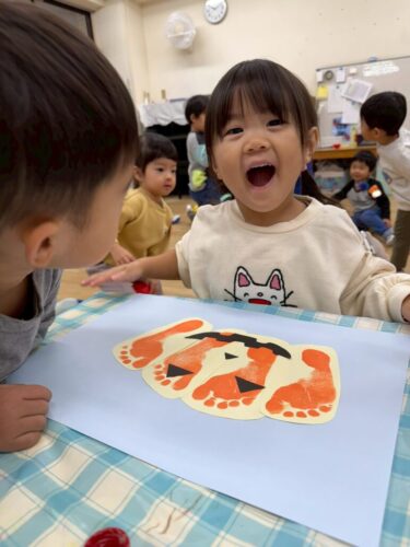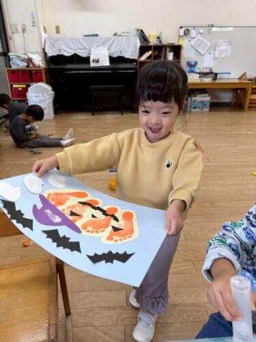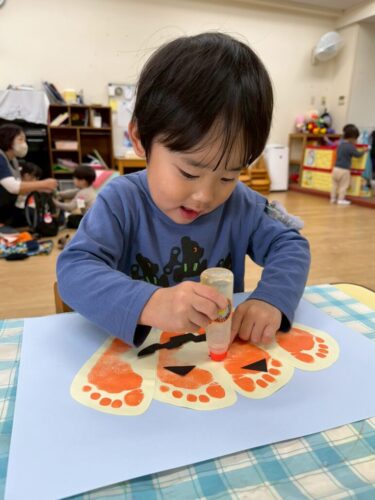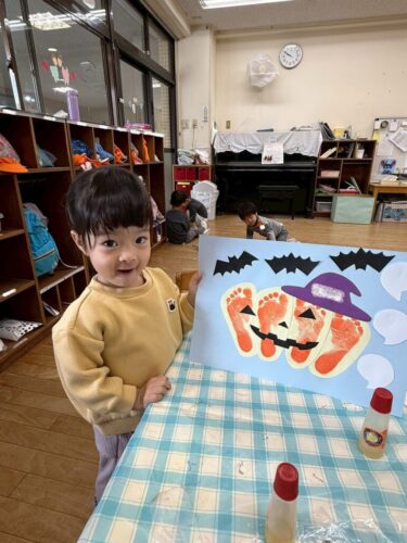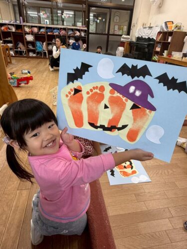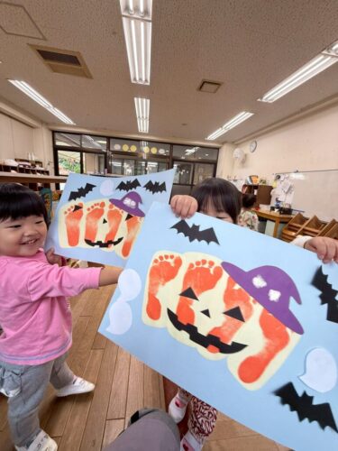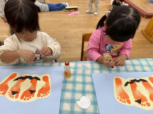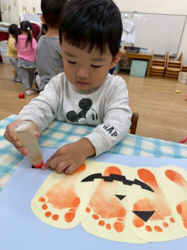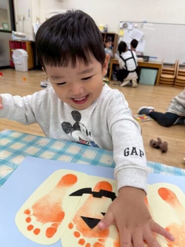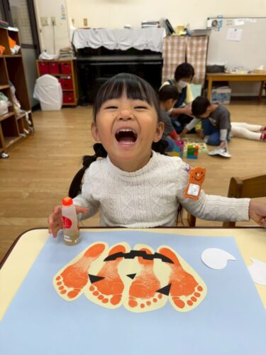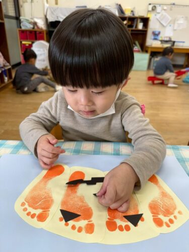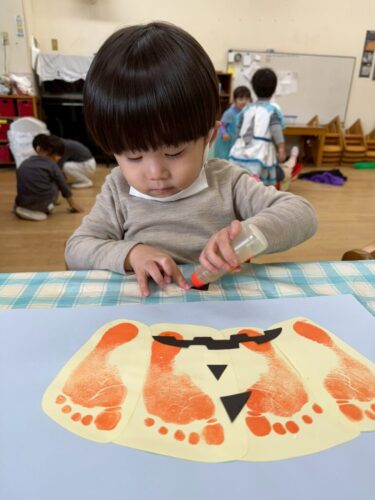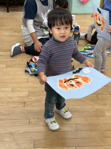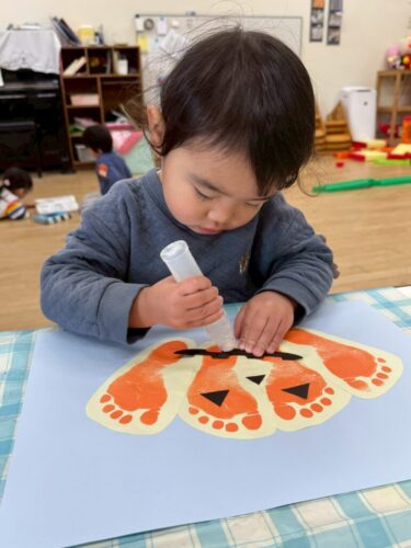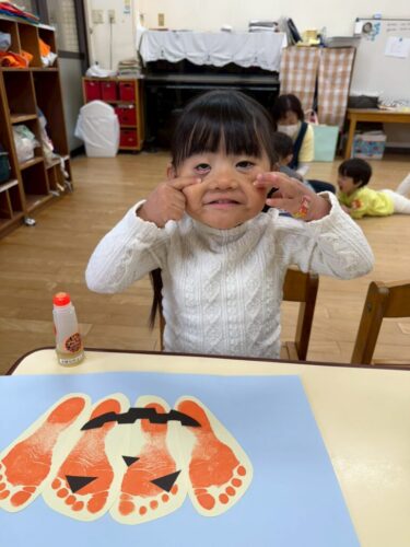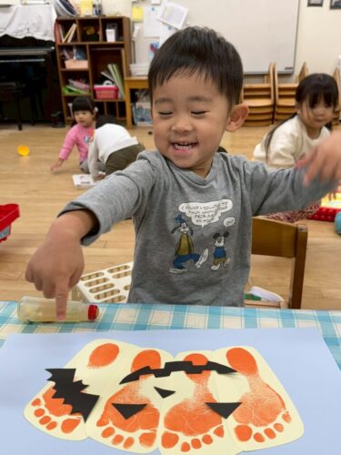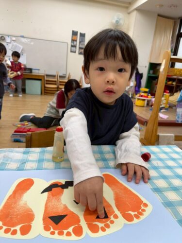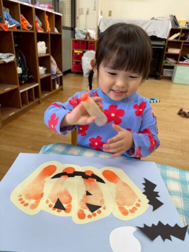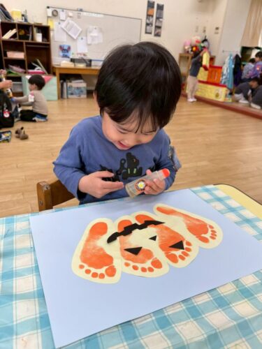 ハロウィン制作をしました。足型をペタッととって、子どもたちが好きなパーツを選んで顔を作り、自分だけの可愛いかぼちゃが完成しました!!「どこに貼ろうかな」「お化けみたいな怖いかぼちゃにする」「かわいいかぼちゃにする」と自分なりのかぼちゃを考えたり、作っている時のにこにこしている顔がとっても可愛かったです♥