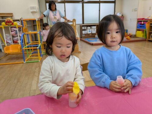 「バナナ味(きいろ)にしようかな~。」「オレンジがいい!」と言いながら作るのを楽しんでくれました。