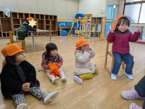 帰りの会には「いないいないばあ」という大型絵本を真似しながらみんなで楽しみました。