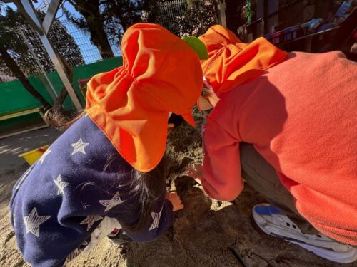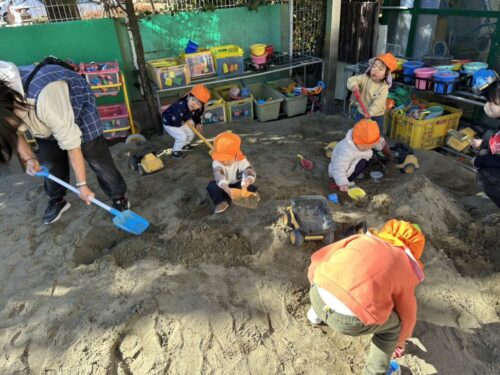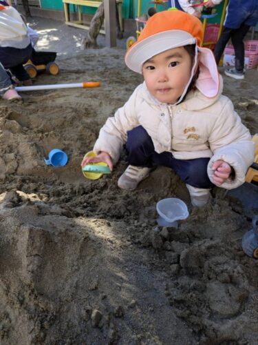 お外では、みんなで砂場で山やご飯を作ったりして遊びました。