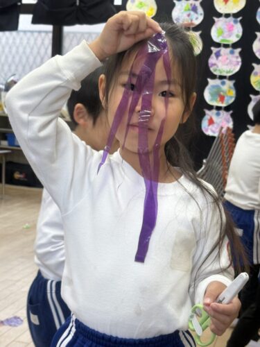 共同制作の海に使ったスズランテープは、子どもたちが切ったものを保育者が束ね、それを他の子たちが細かく裂きました。「○○終わったけど、どこ手伝う?」「誰かこっち手伝ってくれる?」と保育者主導でなくても進んでいく逞しさと頼もしさを感じた日々でした✨