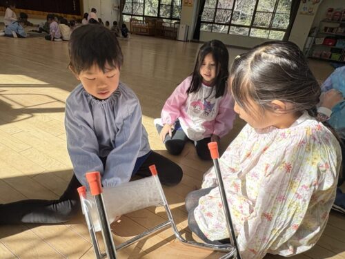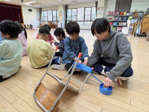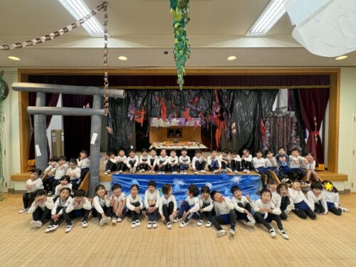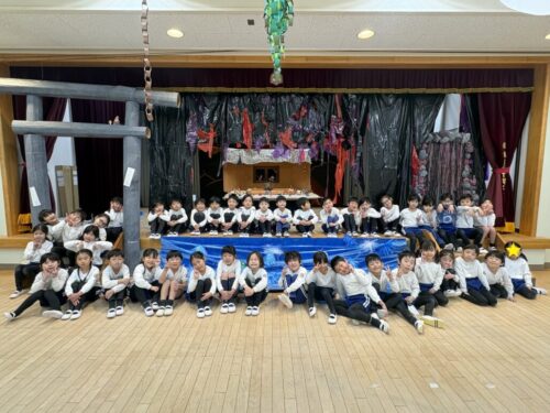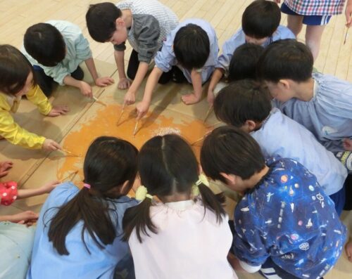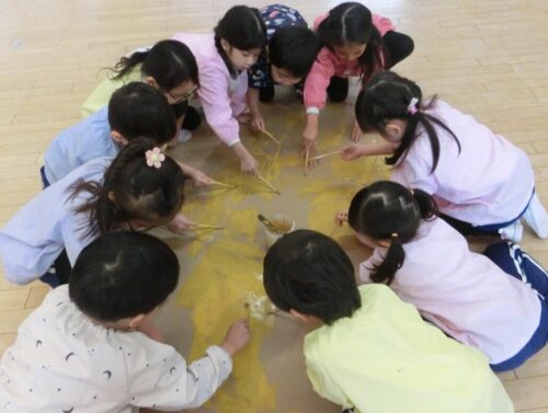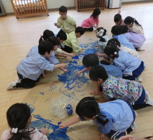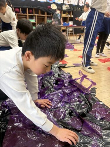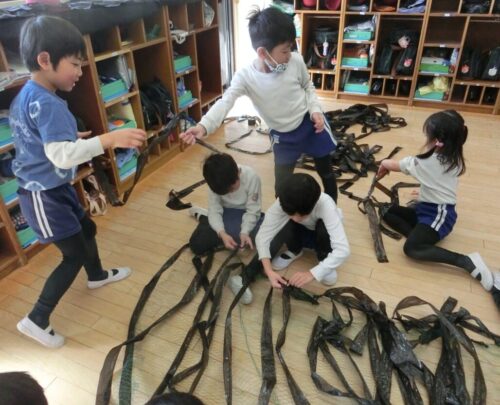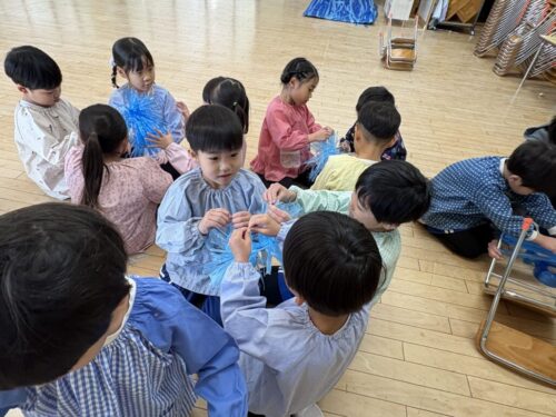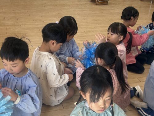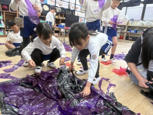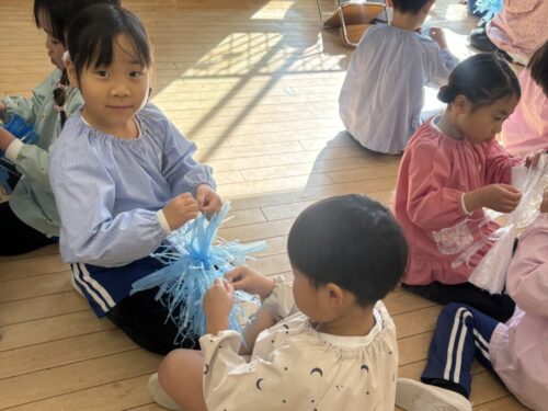 共同制作の海に使ったスズランテープは、子どもたちが切ったものを保育者が束ね、それを他の子たちが細かく裂きました。「○○終わったけど、どこ手伝う?」「誰かこっち手伝ってくれる?」と保育者主導でなくても進んでいく逞しさと頼もしさを感じた日々でした✨