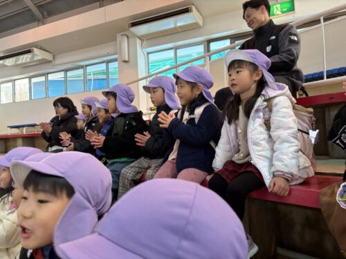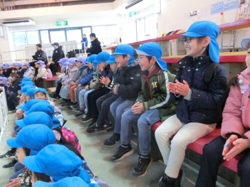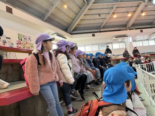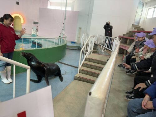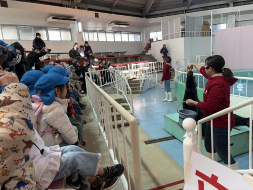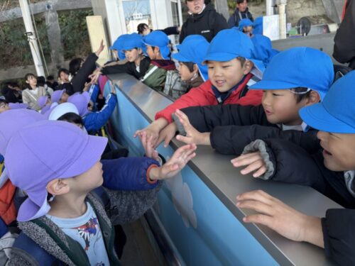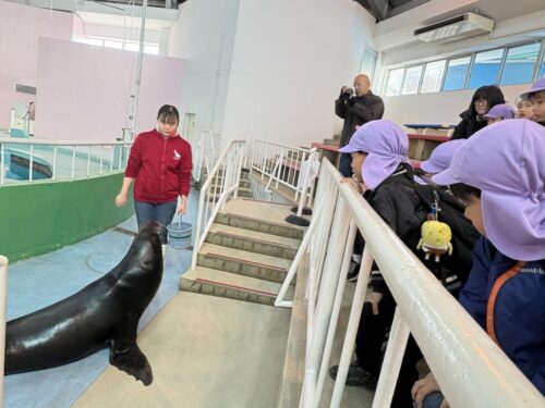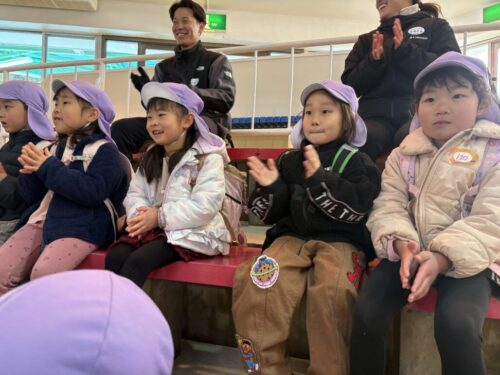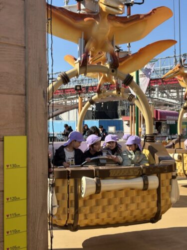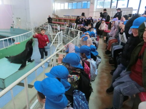 事前に子どもたち同士でどれに乗るかを話していたので、一緒に楽しそうに乗っていました😊また、ちょっと怖いけど友だちと一緒ななら大丈夫!といって乗っている子もいました。クラスみんなで乗る乗り物は2クラスとも【ワンデット】を乗り、ジェットコースターを楽しんでいました。乗り物のあとは、【アシカショー】に行きました。アシカのクイズや芸を見て、「すごい!」「クイズ当たった!」と友だちと話をしながら観ていました。