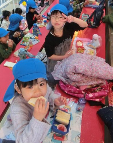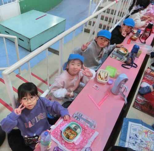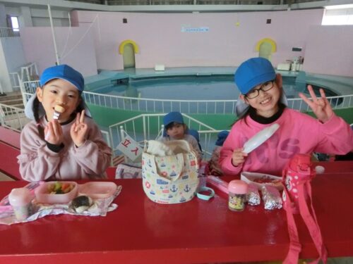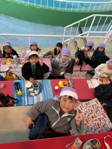 アシカショーの後はお昼ご飯です。お母さんたちのお弁当を美味しく食べていました☺