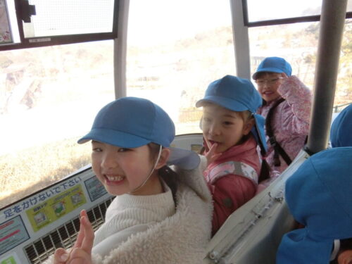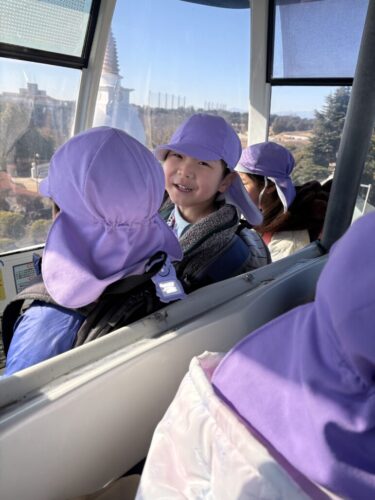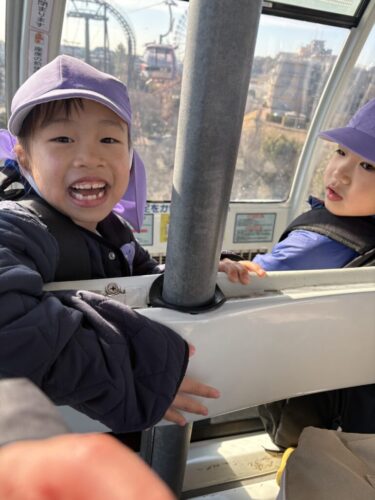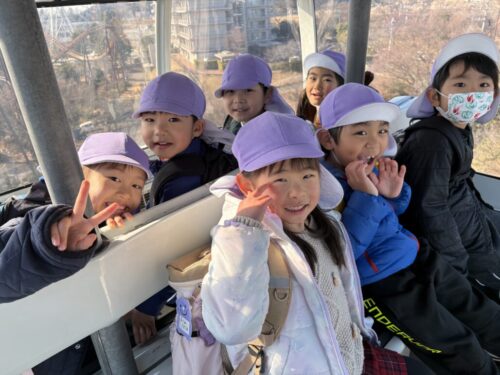 当日、いい天気の中、みんなで南大沢駅を出発しました。電車の中では楽しみにしながらも、マナーを守って乗っていて、さすが年長さん!よみうりランド駅に着くと、スイミングのげんき先生とゆき先生が待っていました!順番にゴンドラに乗り、いざ、よみうりランドへ入園!!
