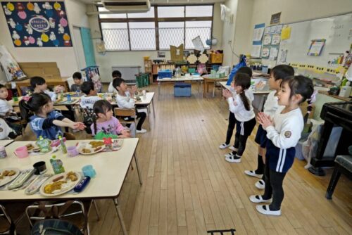 年中組のお当番さんが年長組さんを迎えに行き、お別れ会のスタートです!