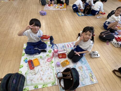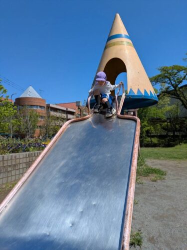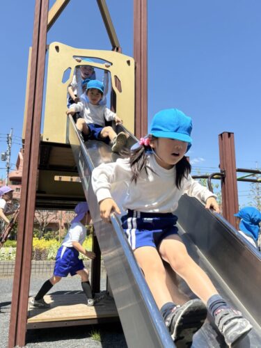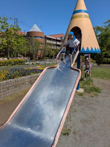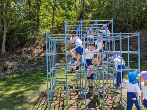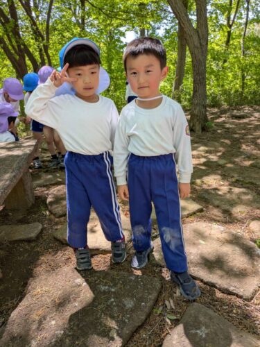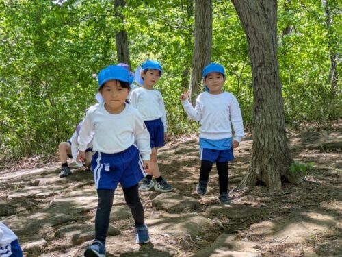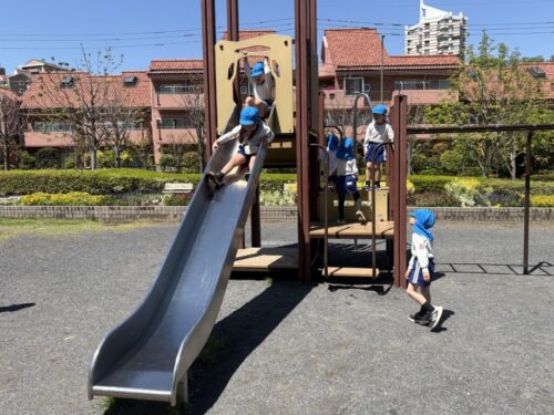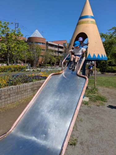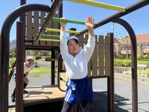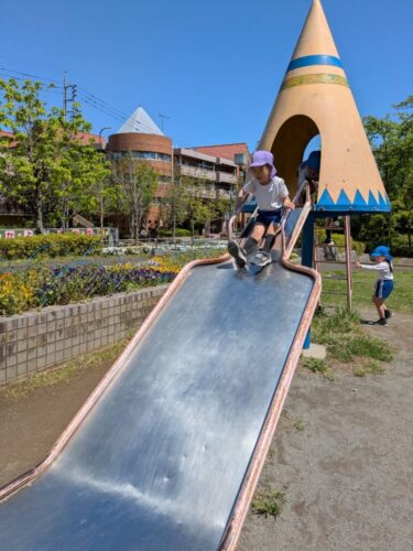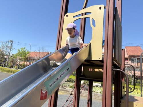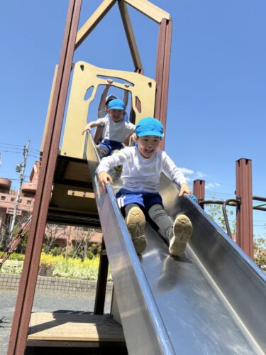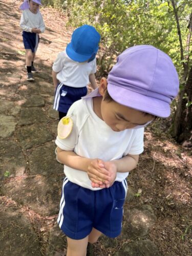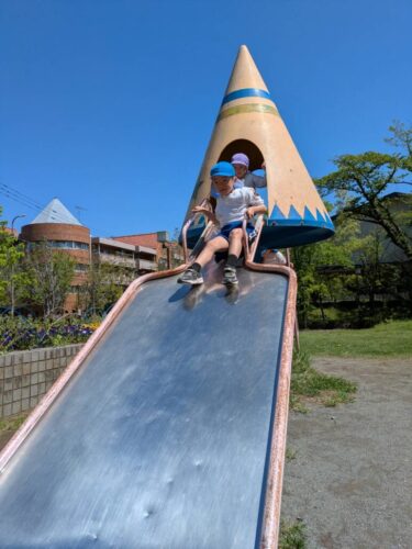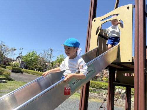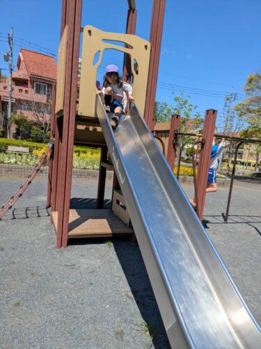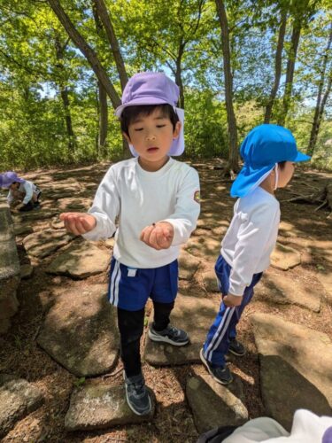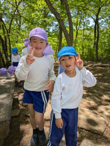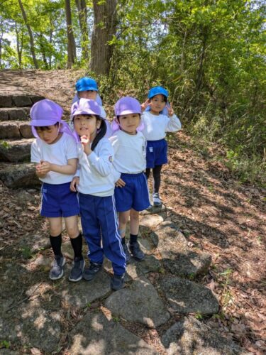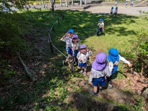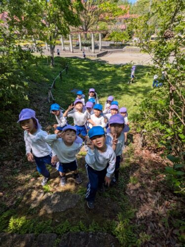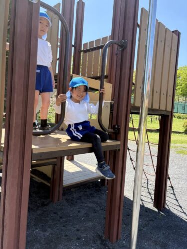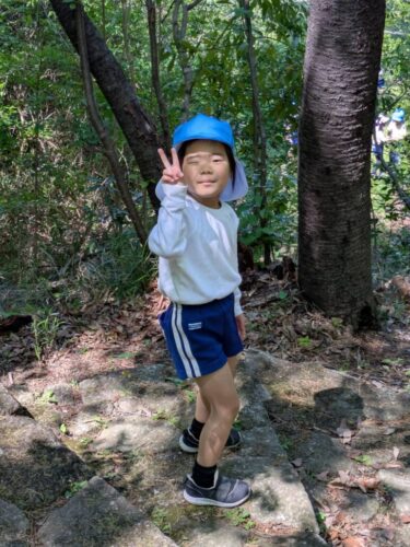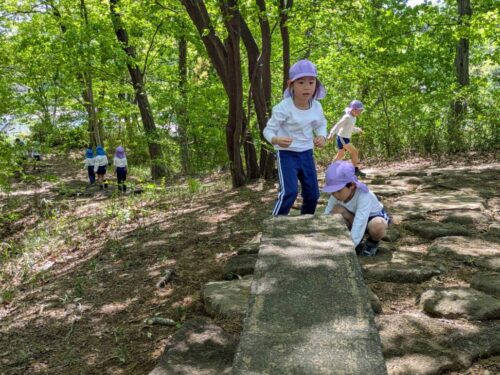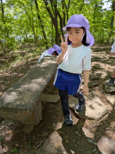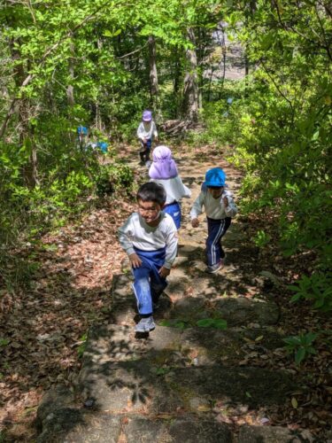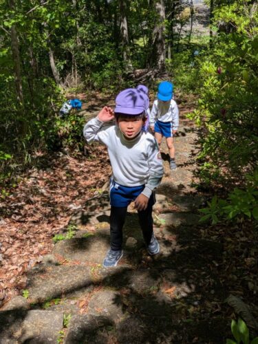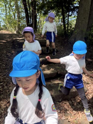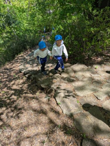 公園ではジャングルジムや滑り台、幼稚園のよりも少し高い雲梯があるので挑戦したり、高台につながる山道の散策を楽しんだりしました😊